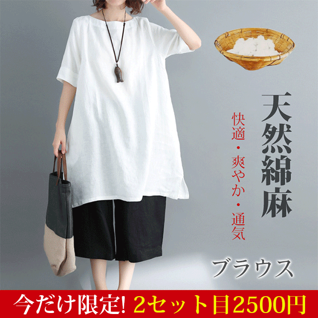 レディース天然綿麻ロングブラウス2点セット 綿麻生地 ワイドスタイル 着痩せ ロングブラウス2点セット タイムセール